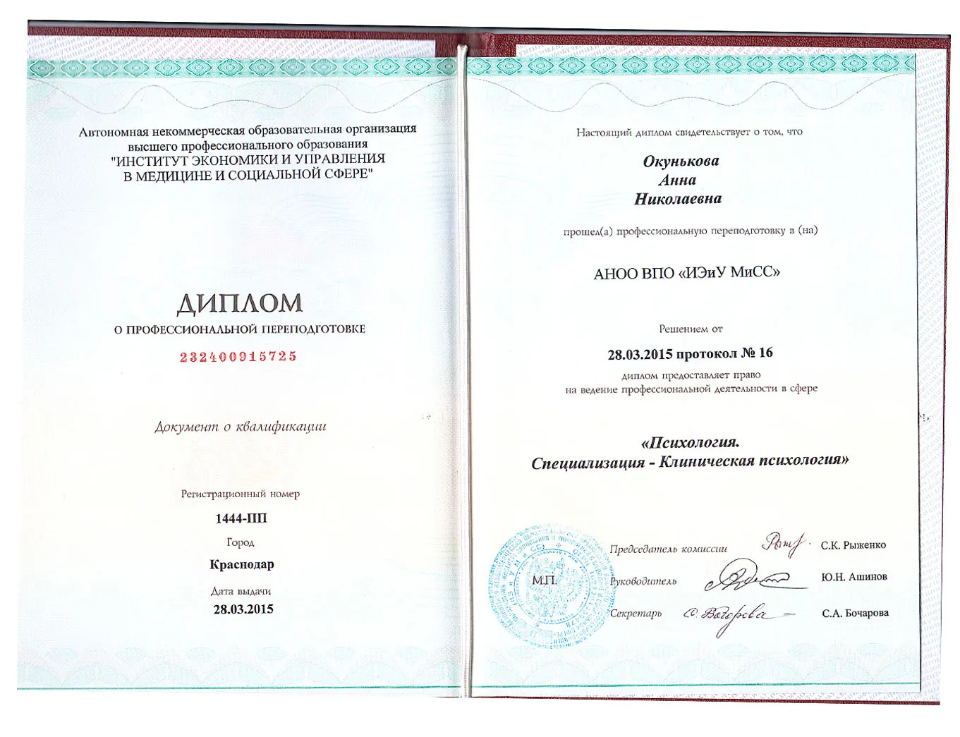 - 2015 - Институт экономики и управления в медицине и социальной сфере ( Диплом о профессиональной переподготовке по программе "Психология. Специализация - Клиническая психология")