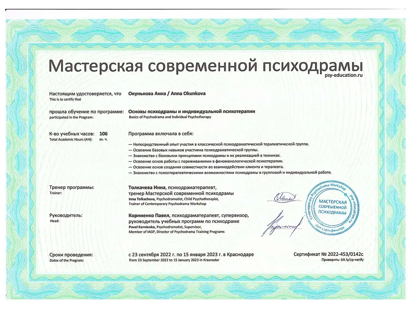 - 2022 - Мастерская современной психодраммы (Сертификат об обучении по программе "Основы психодрамы и индивидуальной психотерапии")