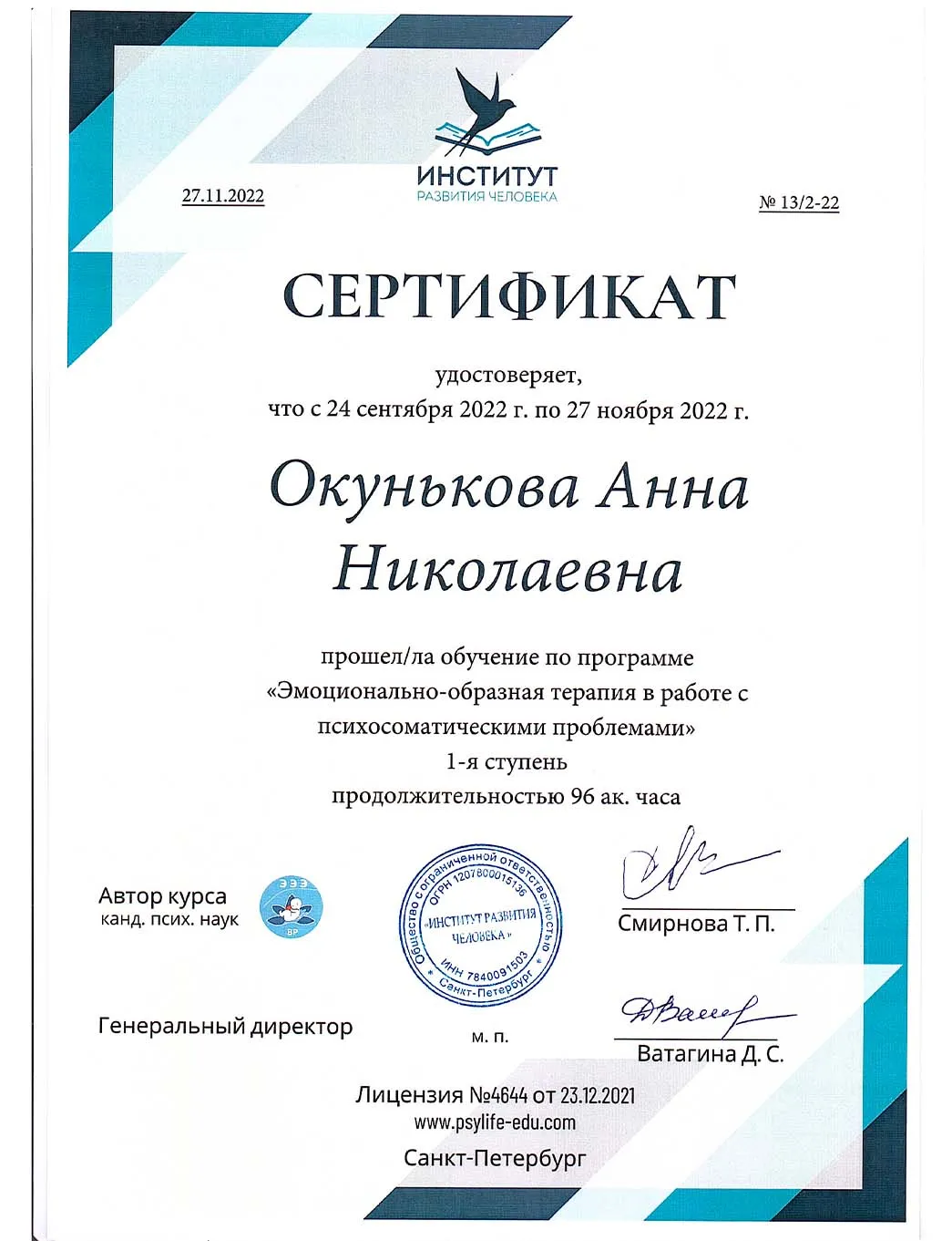 - 2022 - Институт развития человека (Сертификат о прохождении обучения по программе "Эмоционально-образная терапия в работе с психосоматическими проблемами")