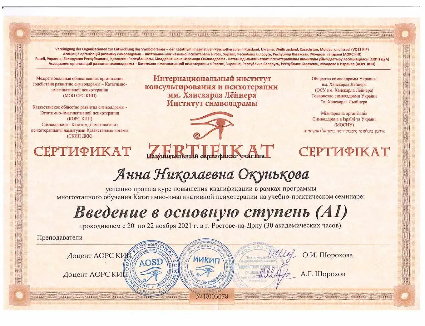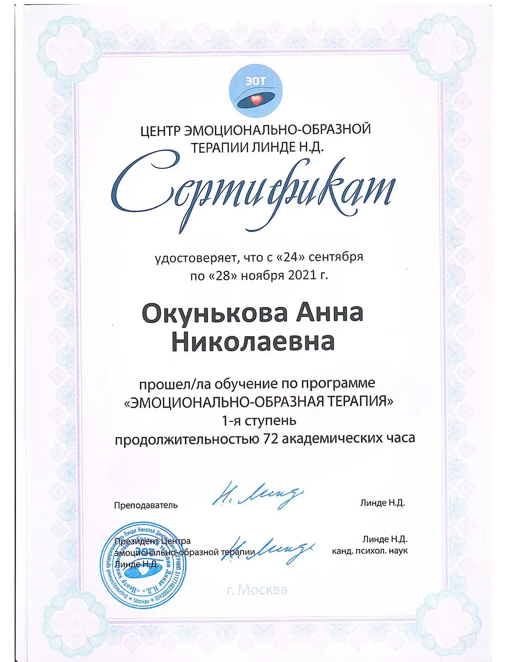 - 2021 - Центр эмоционально-образной терапии Линде Н.Д. (Сертификат о прохождении обучения по программе "Эмоционально-образная терапия")